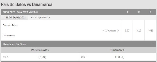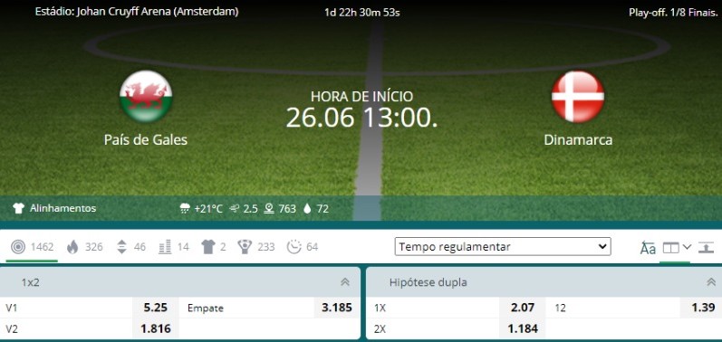 Bodog e 22Bet estão com odds bem parecidos para todos os resultados. No caso da aposta mais comum, vitória da Dinamarca (V2), quem acertar lucra quase o dobro, R$ 1,80 por real. Mas se País de Gales vencer (V1), os odds chegam a 5 para 1.
