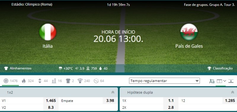 Os odds do jogo entre Itália x País de Gales mostram que o principal palpite é na vitória da seleção italiana. Entre os apostadores dos sites Betfair e 22Bet, a Itália é tida como grande favorita para o jogo desta última rodada.