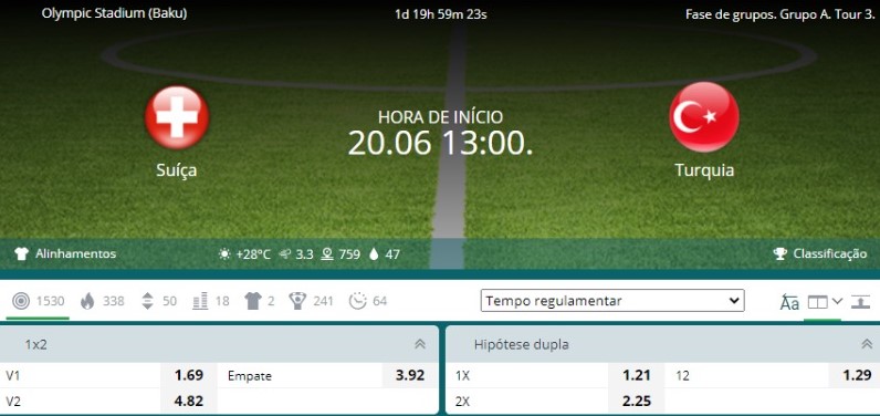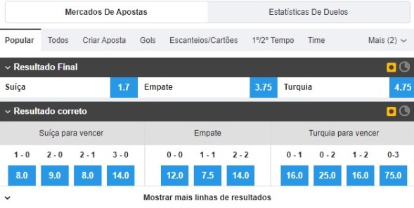 Pelo favoritismo, uma vitória da Suíça está pagando R$ 1,70 por real apostado em ambos os sites, sendo que no 22Bet os odds deste resultado são representados pelo V1, enquanto os da vitória da Turquia estão no V2. Sendo assim, esta não é a aposta mais lucrativa, mas é a mais segura.